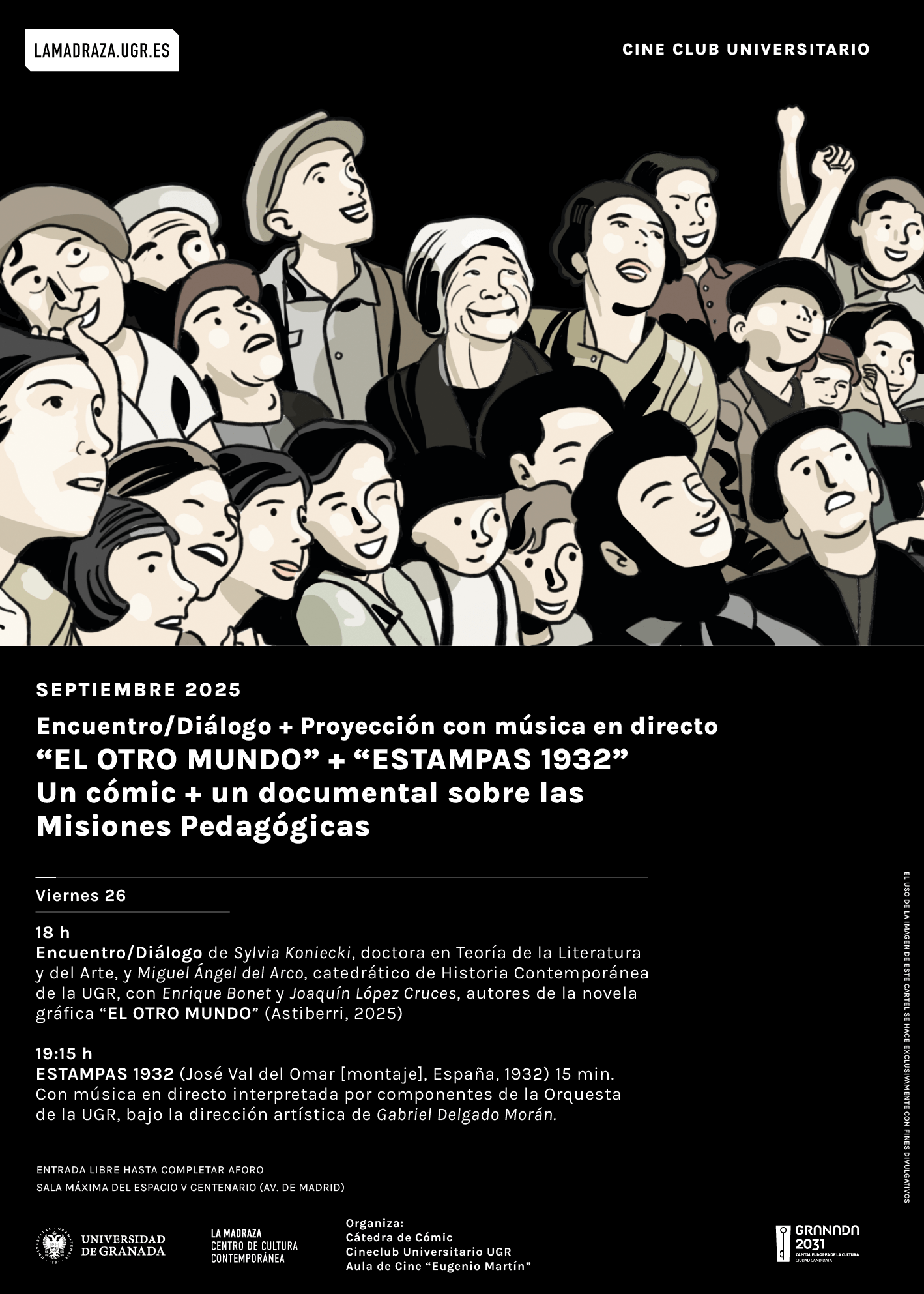 EL OTRO MUNDO se inspira en la experiencia real de la Misión Pedagógica desarrollada en varios pueblos de la Alpujarra granadina en agosto de 1933, entre cuyos miembros se encontraban el cineasta José Val del Omar y el escritor y poeta Antonio Sánchez Barbudo. Creadas por el gobierno de la Segunda República Española, las Misiones Pedagógicas recorrieron los pueblos más humildes y abandonados de nuestra geografía para acercarles la cultura a través de los libros, el cine, el teatro y el arte. Con guion de Enrique Bonet y dibujos de Joaquín López Cruces, esta novela gráfica editada por Astiberri en 2025 quiere indagar en los efectos del choque cultural entre dos mundos que siempre se habían dado la espalda, y en el enfrentamiento entre los anhelos de transformación social y la feroz resistencia al cambio y la pérdida de privilegios. Pretende ser, también, una reflexión sobre el papel transformador de la cultura y el arte, y sobre los límites de la razón para imponerse sobre la barbarie.