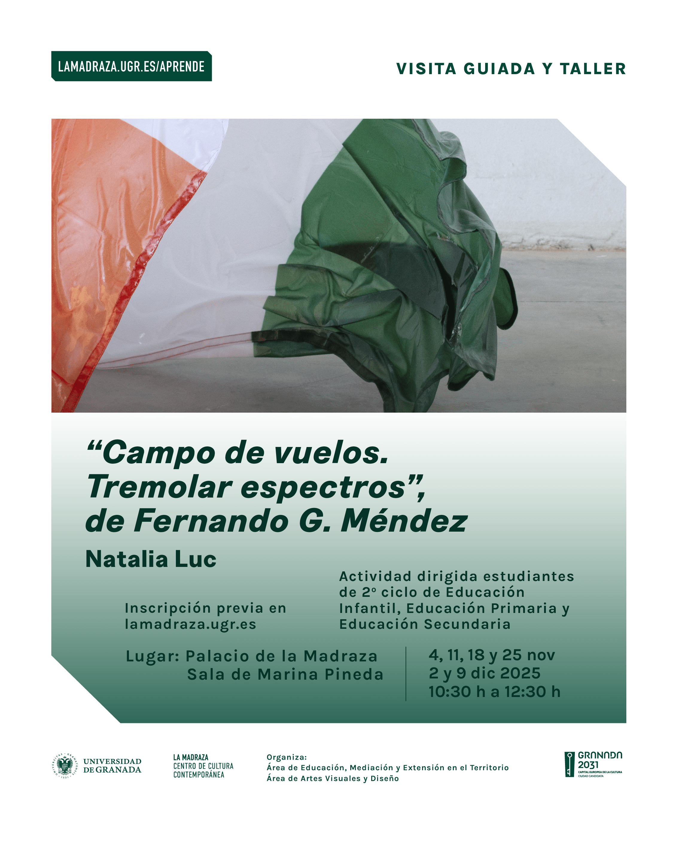 Os proponemos un visita guiada y taller a la exposición «Campo de vuelos. Tremolar espectros» del artista Fernando G. Méndez para explorar su obra y los elementos que la inspiran. Os invitamos a observar y reflexionar sobre las piezas con el propósito de establecer un diálogo con ellas.