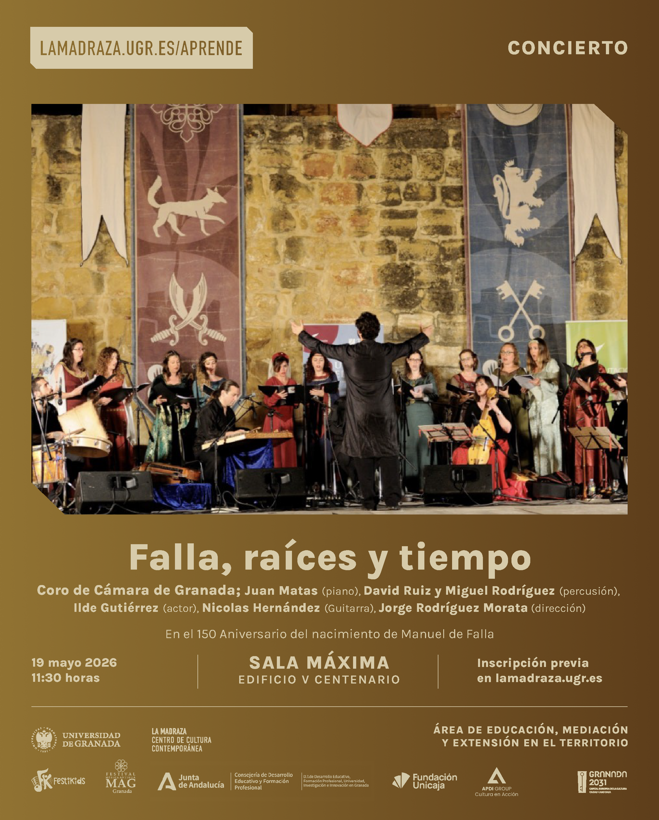El concierto forma parte de la programación del VII Festikids, dedicado a Falla y su relación con la música antigua. Este concierto teatralizado, dirigido al alumnado de 3º ciclo de Educación Primaria y Educación Secundaria, dará a conocer la vida y obra de Manuel de Falla. El elenco del concierto lo conforman el Coro de Cámara de Granada; Juan Matas (piano); David Ruiz y Miguel Rodríguez (percusión); Ilde Gutiérrez (actor); Nicolás Hernández (Guitarra), Jorge Rodríguez Morata (dirección). Además, como novedad en esta edición, el festival oferta un curso formativo para el profesorado que lo desee en el que se dará a conocer el repertorio y las estrategias para trabajarlo en clase, especialmente desde la atención a la diversidad, y así poder participar de manera activa con su alumnado en el concierto. Toda la información sobre este curso en hola@festikids.com.