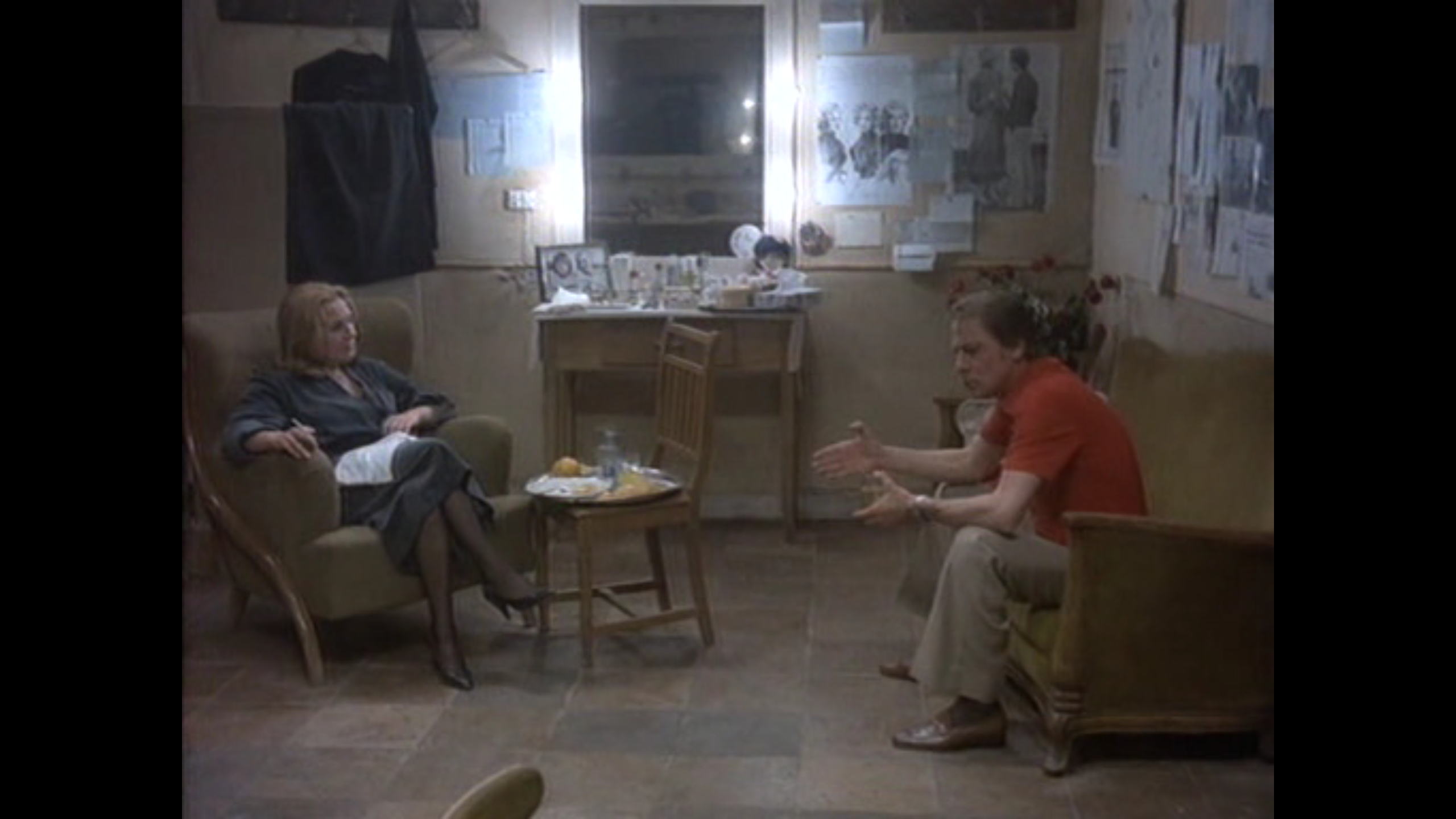 (…) Molina, Sámano, Herrera y su exmarido Daniel Dicenta llegaron a un acuerdo para una película experimental. Se montó un camerino en el estudio donde los cuatro espejos eran también cristales (como las salas de interrogatorios de la policía) y tras ellos había ocho cámaras y diez micrófonos, también escondidos, repartidos por todos los rincones. De esta manera los dos intérpretes, Herrera y Dicenta, se sintieron con la intimidad suficiente como para arrancar una conversación ininterrumpida que se rodó sin guion previo y durante una hora y cuarenta minutos, con una única consigna: hablar de sus vidas. Es decir, se subvierte la lógica de las películas que giran en torno al teatro y un subtexto más o menos evidente: aquí es la obra teatral la que resuena en la vida real y no al revés. El resultado de este dispositivo totalmente inédito, moderno y verdadero como lo son las películas que hacía Eduardo Coutinho en Brasil, son 90 minutos donde afloran reproches y confesiones y se pone nombre a una serie de problemas heredados de la dictadura que seguían ocultos en la Transición. El montaje alterna la conversación con fragmentos de la obra teatral, de la vida personal de Lola Herrera y de los dos hijos que tuvieron. Por tanto, lo que hizo a la película “ensanchar los límites establecidos del cine”, como escribió Ángel Fernández Santos en “Diario 16”, fue su propio mecanismo de filmación: principalmente, el hecho de que no existía guion; pero no como se suele pensar del documental, que a menudo tiene una estructura tanto o más pensada que la ficción. Este es un buen lugar desde el que pensar FUNCIÓN DE NOCHE, porque no es documental ni ficción y la incluye en una taxonomía cinematográfica donde está sola. Como único miembro de su categoría, los críticos la han dejado fuera de sus listas por rara. (…)